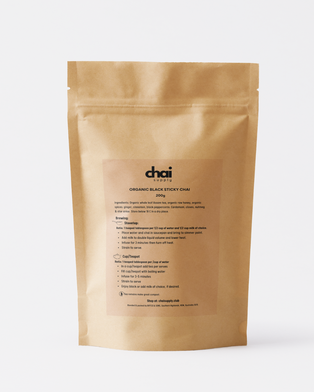 - 1 x 200g pack of our Organic Black Sticky Chai - delicious, warm, spiced, with no sickly sweetness, just honey, rich roasted spices and Assam tea for a full bodied cup (or cups!) of yum.
